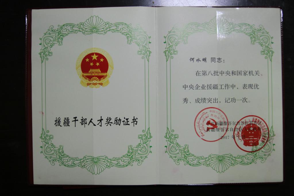 近日获悉, ggjav 何水明同志被新疆自治区党委和政府评为“第八批中央和国家机关、中央企业优秀援疆干部人才”,并授予奖牌和奖章。
