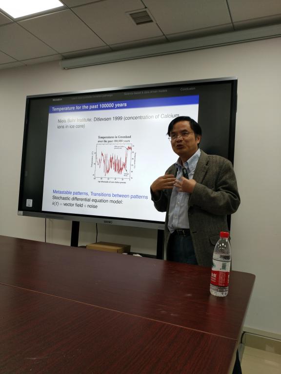 作为 ggjav 校庆67周年学术交流周名家论坛嘉宾同时作为“数理论坛”第114期嘉宾,段金桥教授做了一场“数据科学碰上动力系统:我们可以学到什么?”的精彩报告。段金桥教授首先从基因随机表达的现象和数据出发进入主题,然后介绍了大气科学以及全球温度变化的模式和数据,进一步引出了随机微分方程及其在地球科学问题中的应用,特别针对非高斯噪声体系,结合一个双稳态模型详细阐述了如何从数据出发进行模型的学习和优化,并寻找最大可能迁移轨道。段金桥教授的报告将数据科学和不确定性及非线性动力系统问题紧密联系在一起,并总结了若干地球科学、生命科学问题研究中的数学挑战。报告加深了大家对于应用数学的认识,启发了听众对于数据科学新的思考。