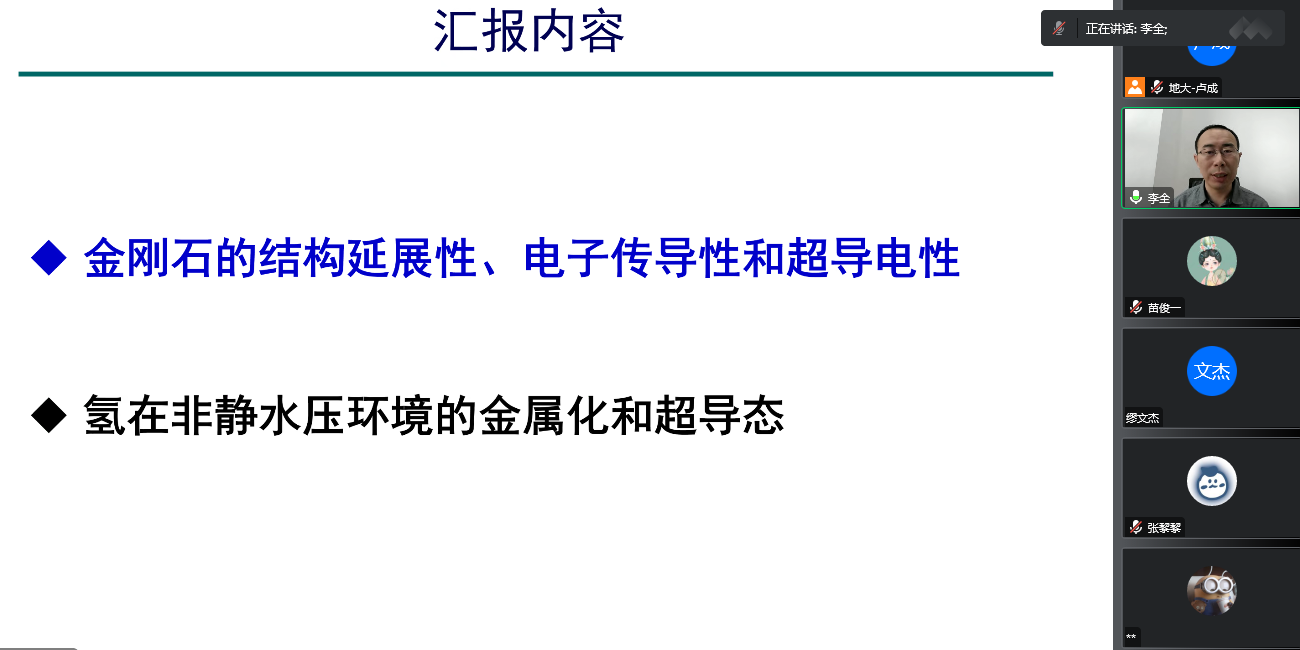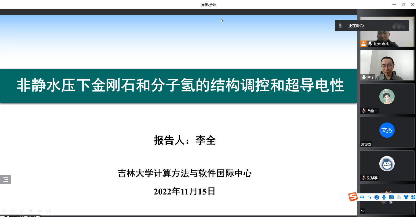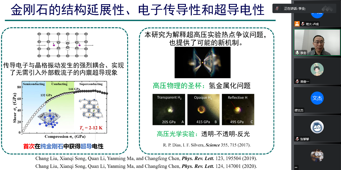 为迎接 ggjav 七十周年校庆,11月15日上午,ggjav 通过线上的方式,邀请吉林大学计算方法与软件国际中心李全教授,为 ggjav 物理系师生做了题为《非静水压下金刚石和分子氢的结构调控和超导电性》的学术报告。该报告由 ggjav 科学技术发展院、ggjav 联合举办,卢成教授主持,本院师生共计60余人参加。