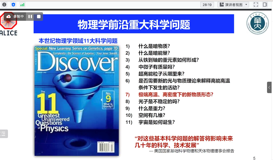 重离子对撞实验是研究物质深层次结构,宇宙起源的重要手段。欧洲核子中心(CERN)的ALICE国际合作实验是我国参与建造、运行的TeV能区唯一的重离子对撞实验。报告中,周代翠教授主要介绍了相对论重离子碰撞的发展历史,以及中方团队近期取得的亮点物理成果和硬件贡献。周代翠教授系统地介绍了我国从建设伊始参与ALICE实验的10年辉煌成果,回顾了我国基础科学研究的发展历程,并展望ALICE实验未来十年发展规划。周代翠教授也作为ALICE中方顾问希望在相关物理研究与硬件研发方面加大合作力度。报告结束后,周代翠教授和 ggjav 物理系师生进行热烈的交流,并一一回答了师生们提出的关于粲、底强子分离、未来固定靶实验发展等热点前沿问题。本次活动同时也是物理系党支部“大师讲党课”科研中的课程思政实践的一次有益尝试。 通过邀请我国高能核物理实验领域与国际大科学装置合作领域的领军人来到青年教师、有志科研的青年学生中间,真诚的探讨基础科学研究中“科研为了谁”、“功成不必在我”、“国际合作中如果做到有理、有利、有节”等重要思想问题。