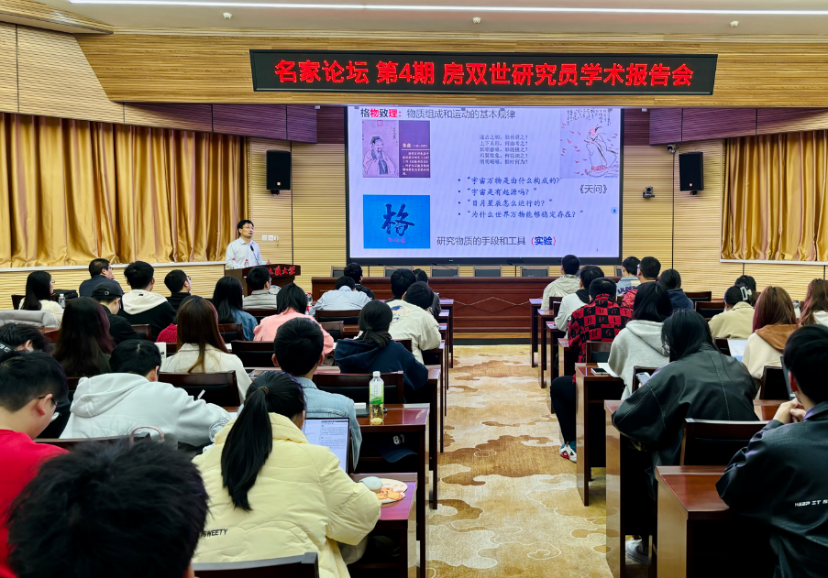 2024年4月7日,中国科学院高能物理研究所房双世研究员做客 ggjav (武汉)名家论坛,在南望山校区八角楼学术报告厅作了题为“对撞生新态”的学术讲座。报告会由 ggjav 副院长张保成教授主持, ggjav 师生90余人参加。