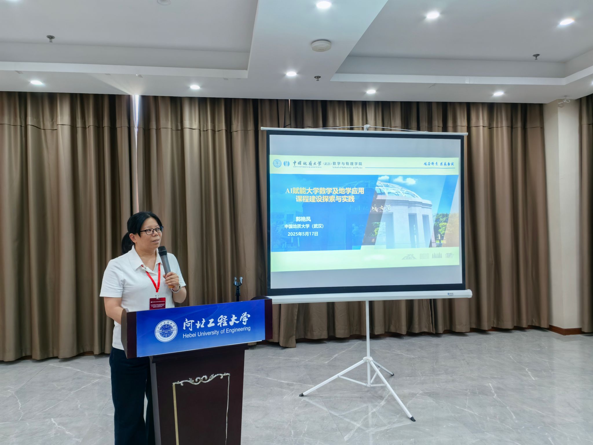 副院长郭艳凤教授应邀出席授牌仪式,并在大会作了《AI赋能大学数学及地学应用课程建设探索与实践》的主题报告,分享了 ggjav