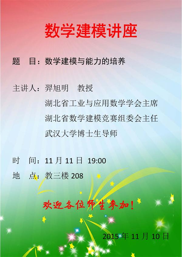 应大学数学部杨瑞琰教授的邀请,武汉大学博士生导师羿旭明教授将于11月11日19:00在 ggjav 教三楼208教室做数学建模方面的专题报告。羿旭明教授长期参与全国大学生数学建模竞赛湖北赛区的领导和评卷工作,具有丰富的数学建模指导经验,他本次报告的题目是“数学建模与能力的培养”,热烈欢迎 ggjav 全体师生前往参加!