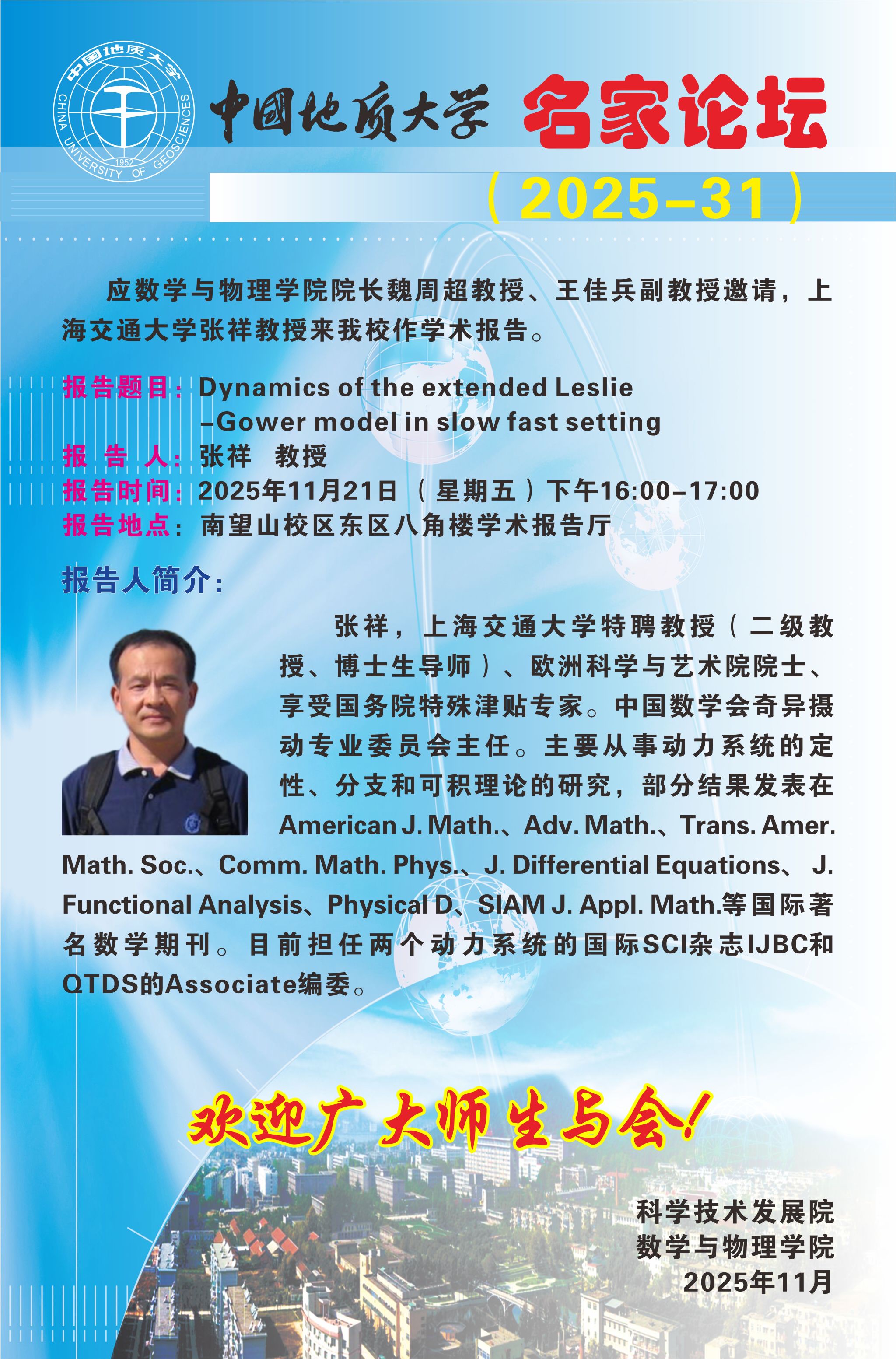2025年11月21日张祥教授学术讲座:Dynamics of the extended Leslie-Gower model in slow fast setting