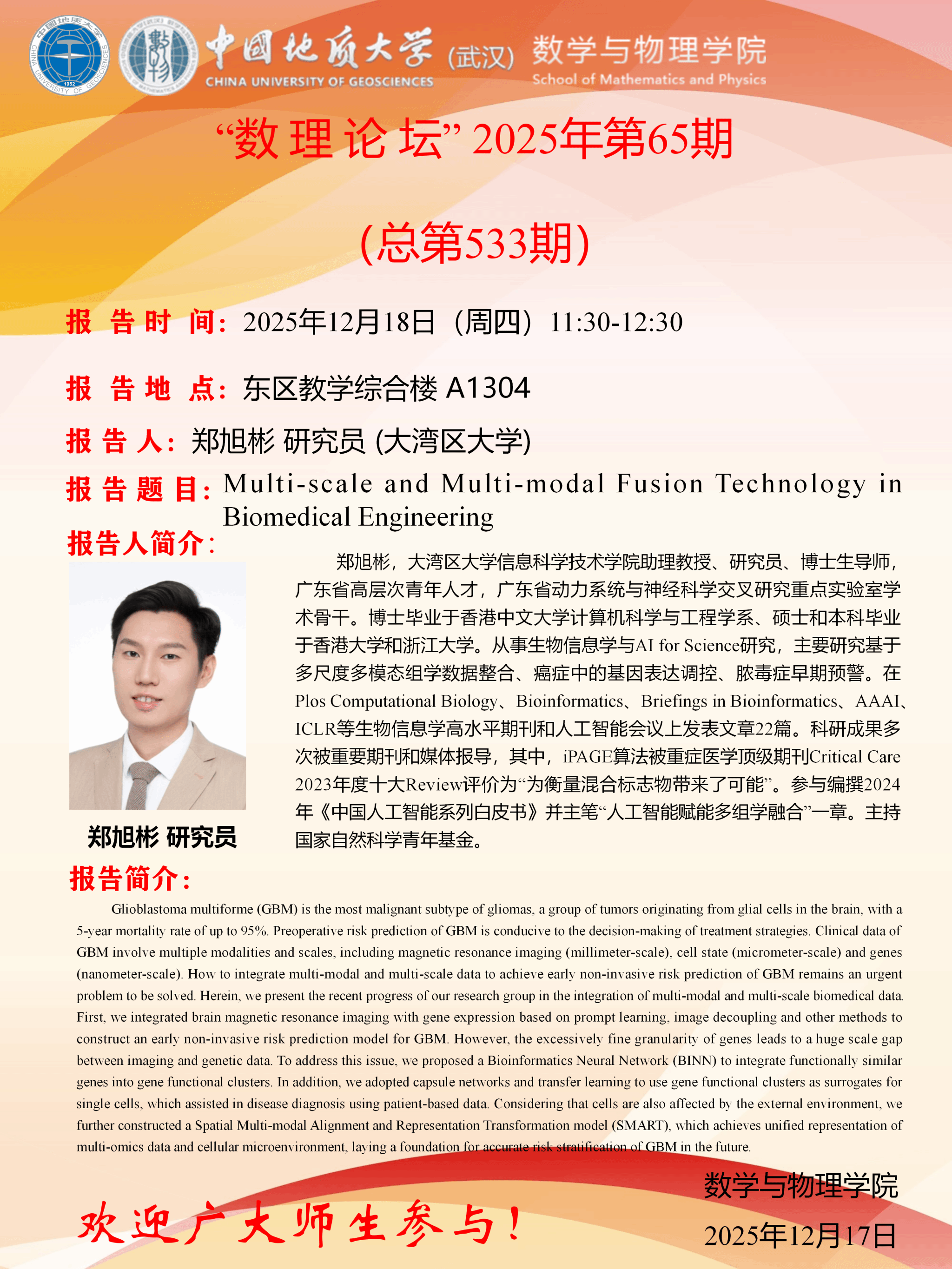 2025年12月18日郑旭彬研究员学术讲座:Multi-scale and Multi-modal Fusion Technology in Biomedical Engineering