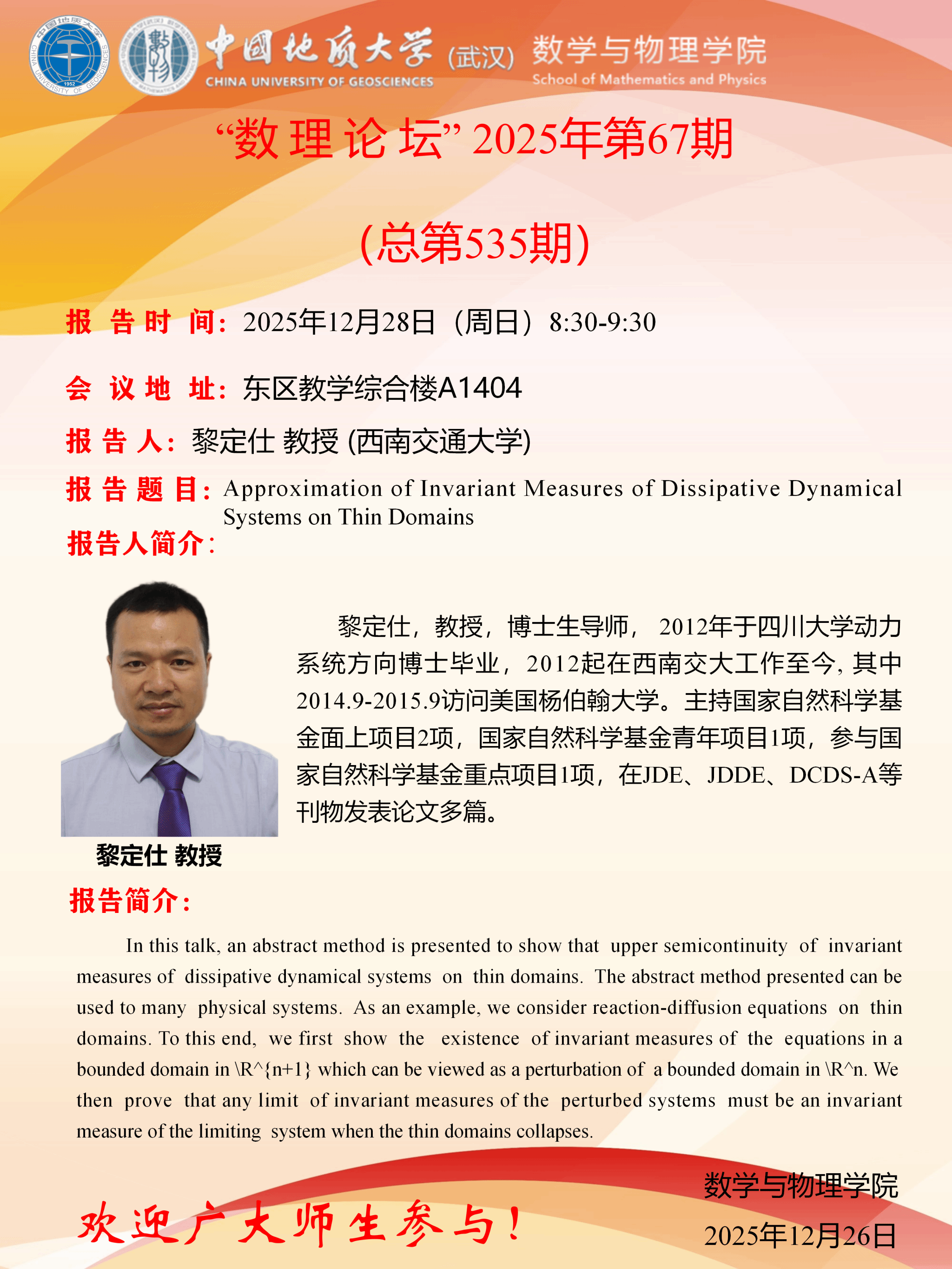 2025年12月28日黎定仕教授学术讲座:Approximation of Invariant Measures of Dissipative Dynamical Systems on Thin Domains
