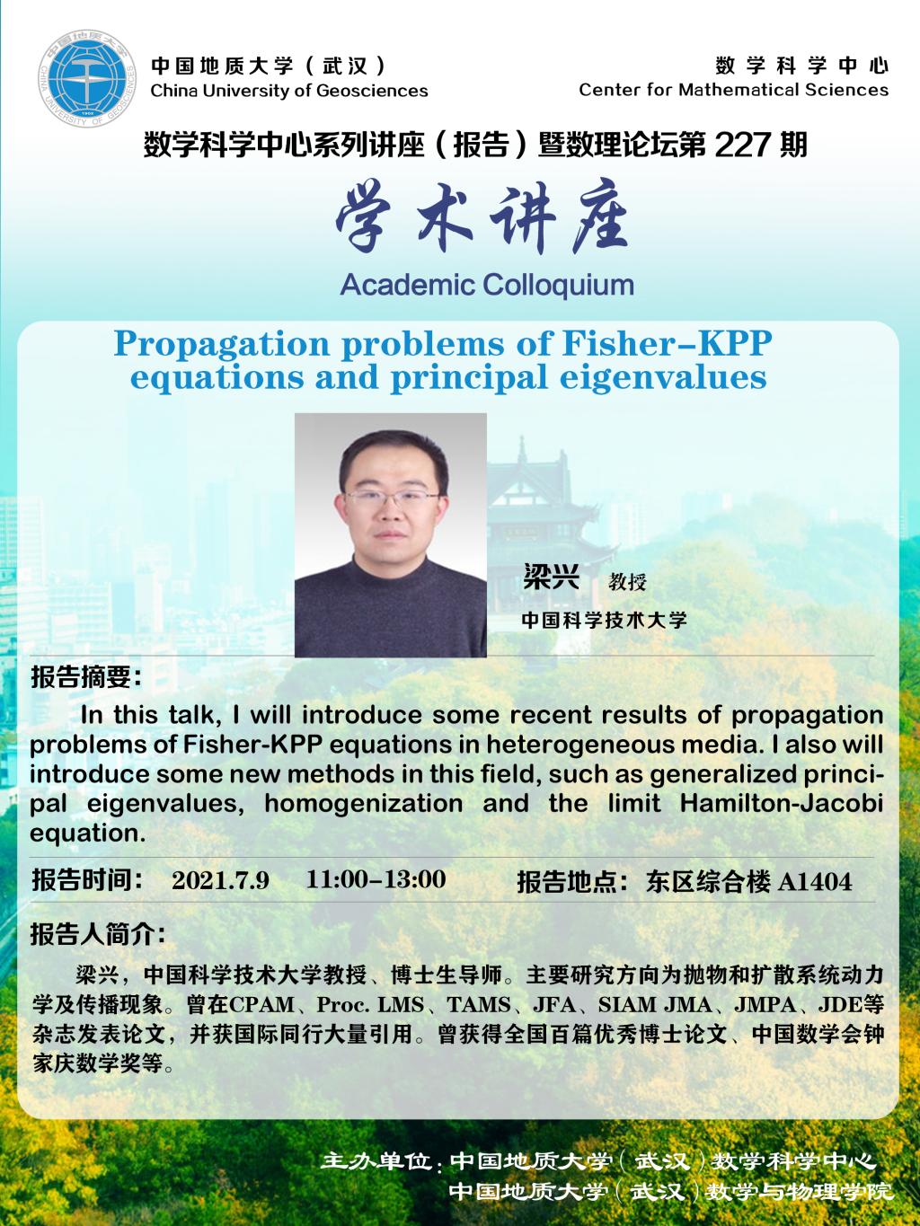 "数理论坛"第227期暨数学科学中心系列讲座(报告):Propagation problems of Fisher-KPP equations and principal eigenvalues