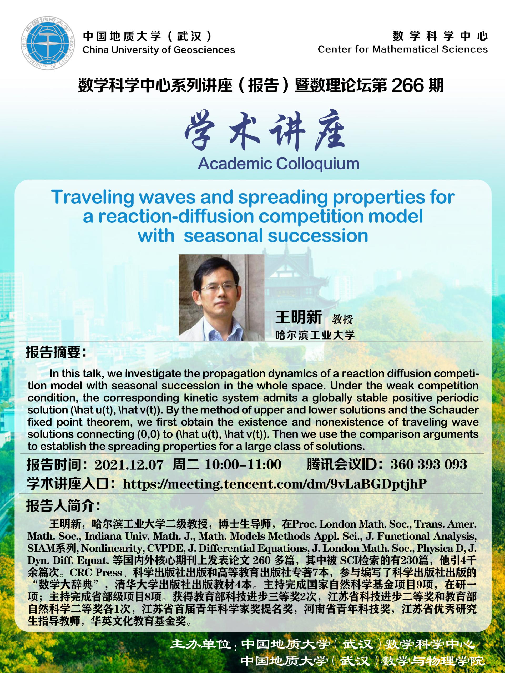 "数理论坛"第266期暨数学科学中心系列讲座(报告):Traveling waves and spreading properties for a reaction-diffusion competition model with seasonal succession
