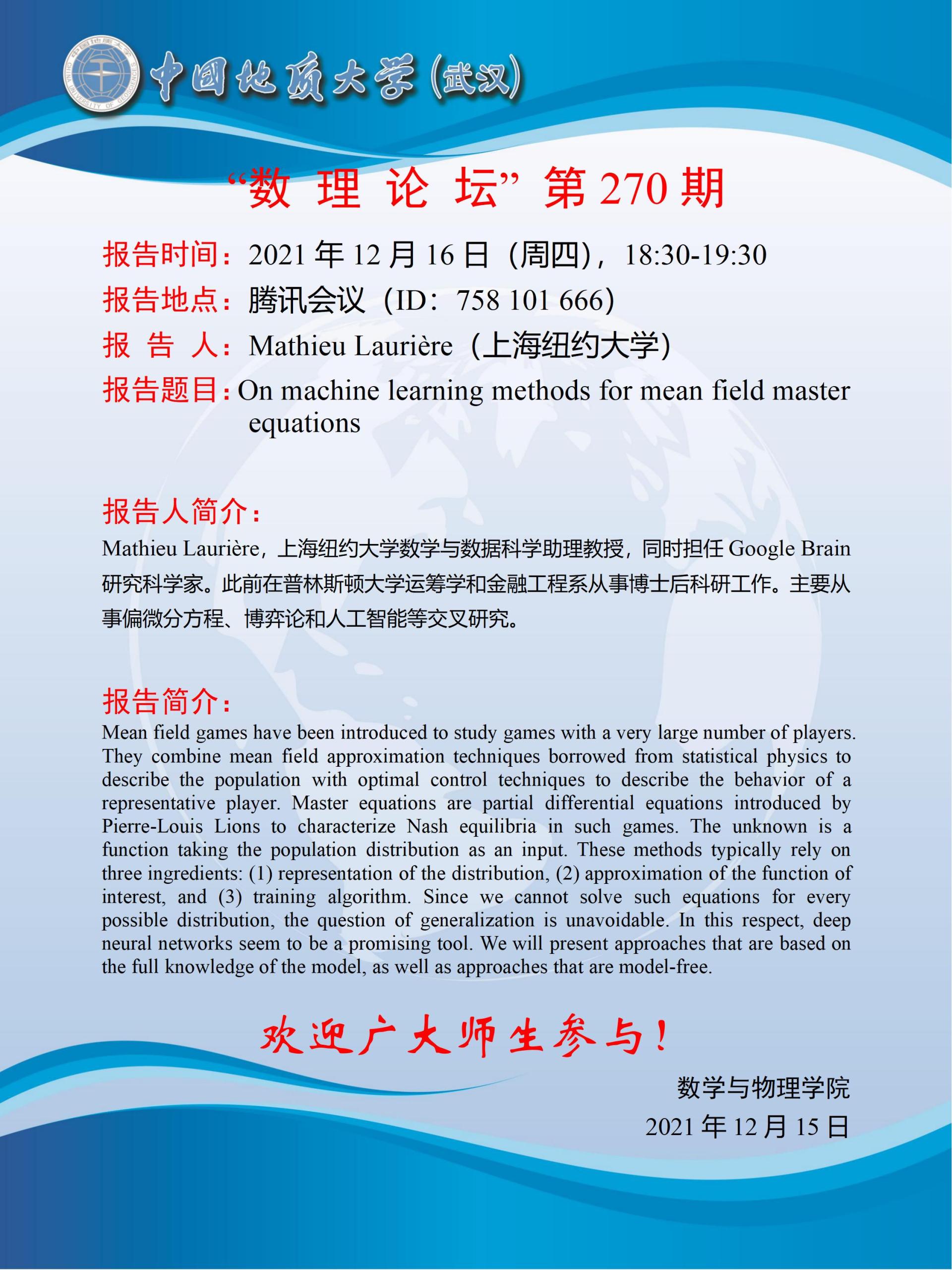 "数理论坛"第270期:On machine learning methods for mean field master equations