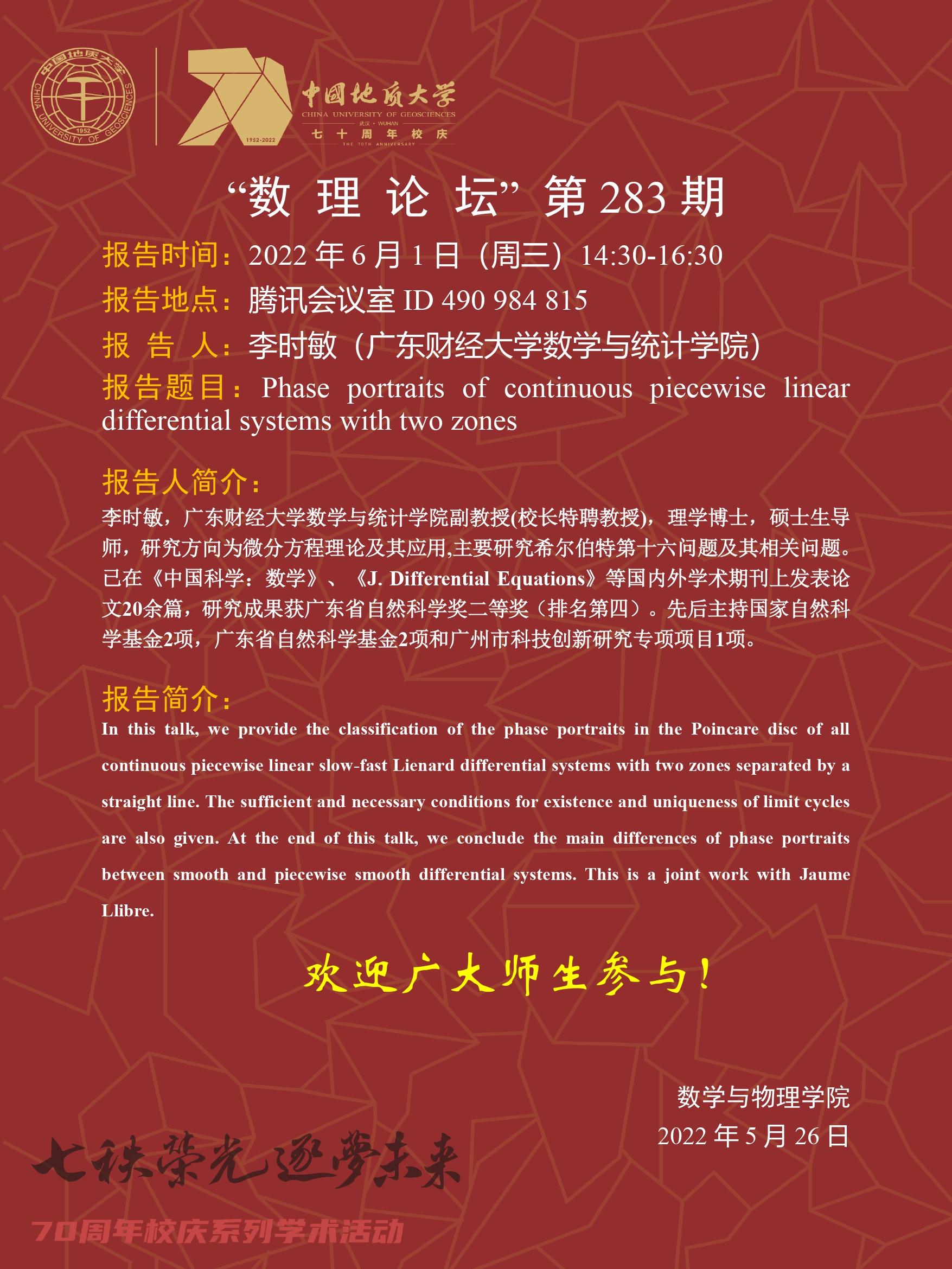 "数理论坛"第283期:Phase portraits of continuous piecewise linear differential systems with two zones