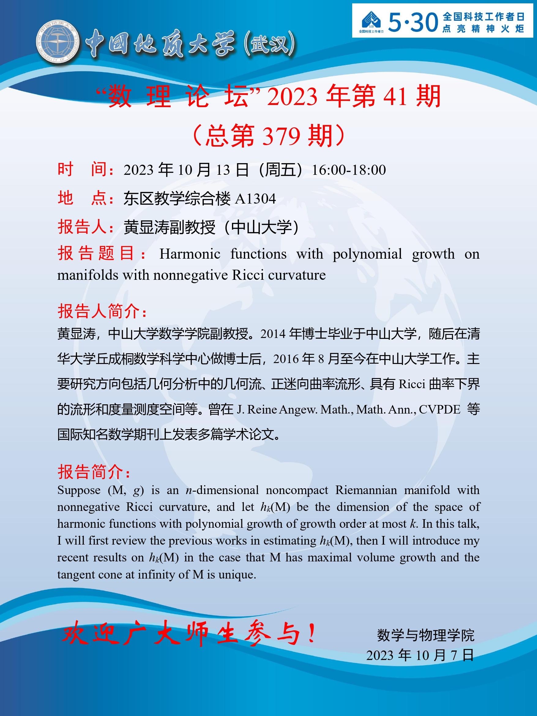 2023年10月13日黄显涛副教授学术讲座:Harmonic functions with polynomial growth on manifolds with nonnegative Ricci curvature