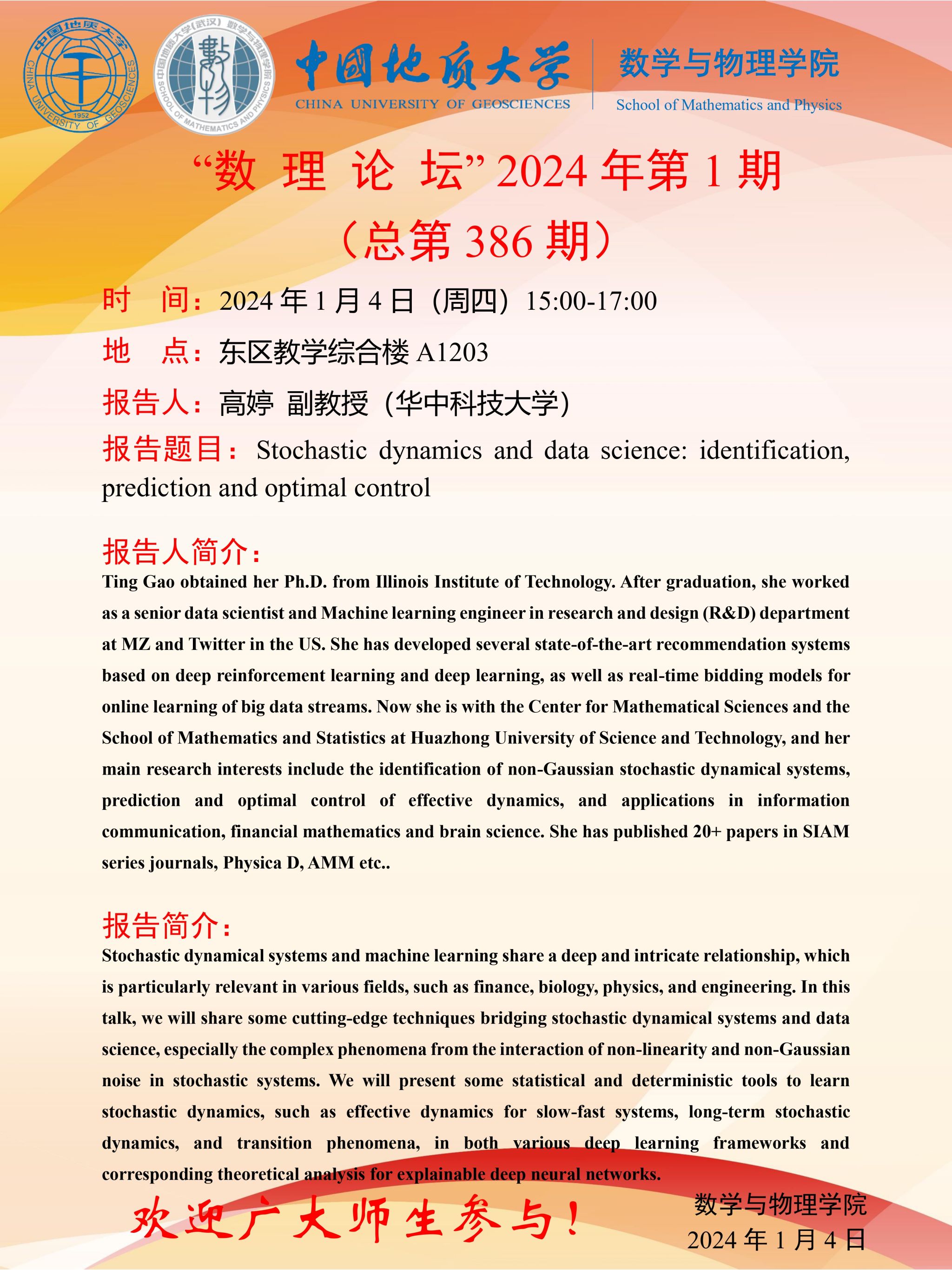 2024年1月4日高婷副教授学术讲座:Stochastic dynamics and data science: identification, prediction and optimal control