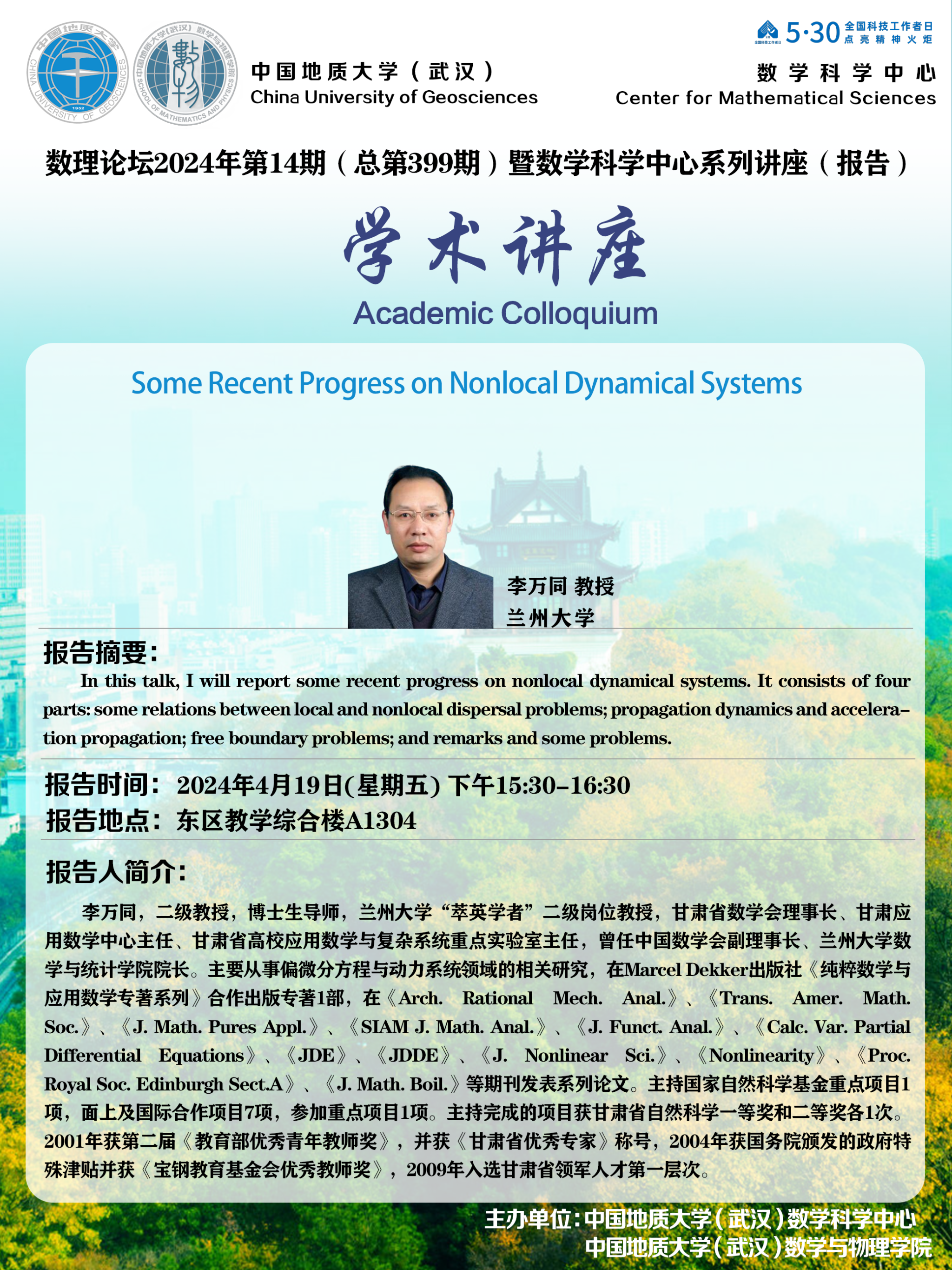 2024年4月19日李万同教授学术讲座:Some recent progress on nonlocal dynamical systems