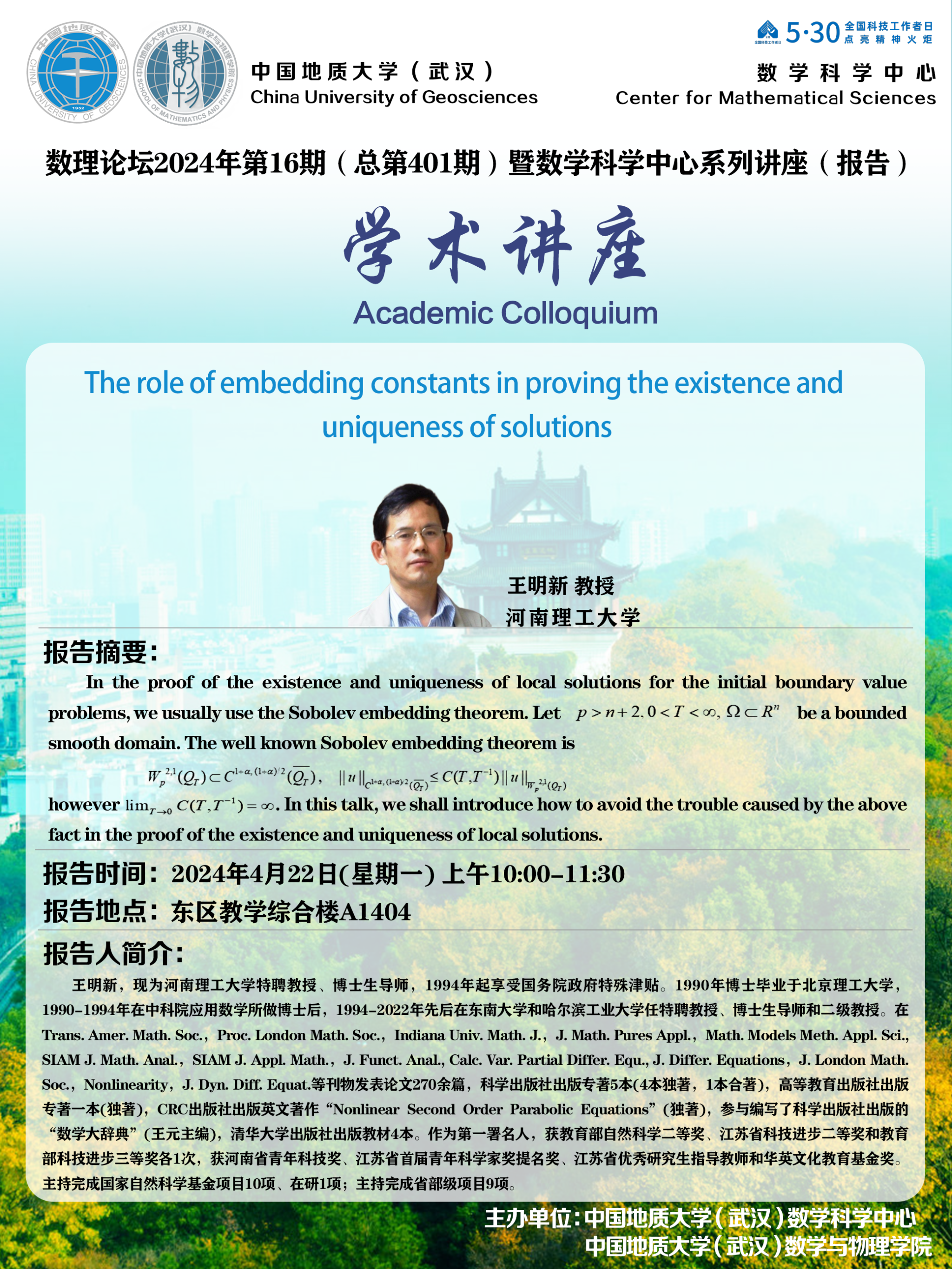 2024年4月22日王明新教授学术讲座:The role of embedding constants in proving the existence and uniqueness of solutions
