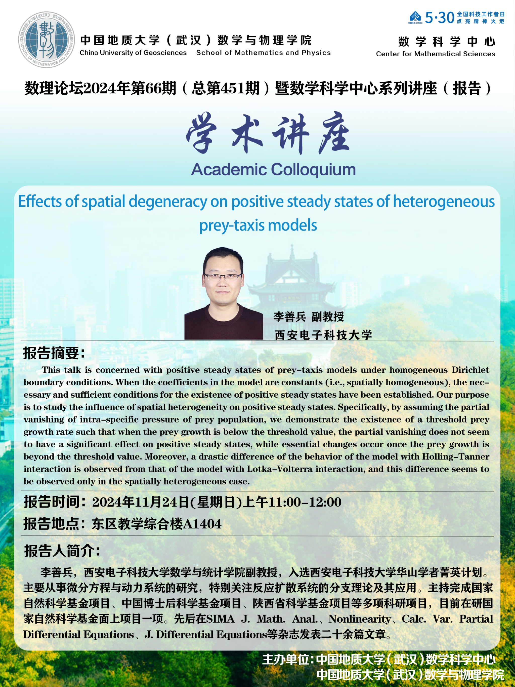 2024年11月24日李善兵副教授学术讲座:Effects of spatial degeneracy on positive steady states of heterogeneous prey-taxis models