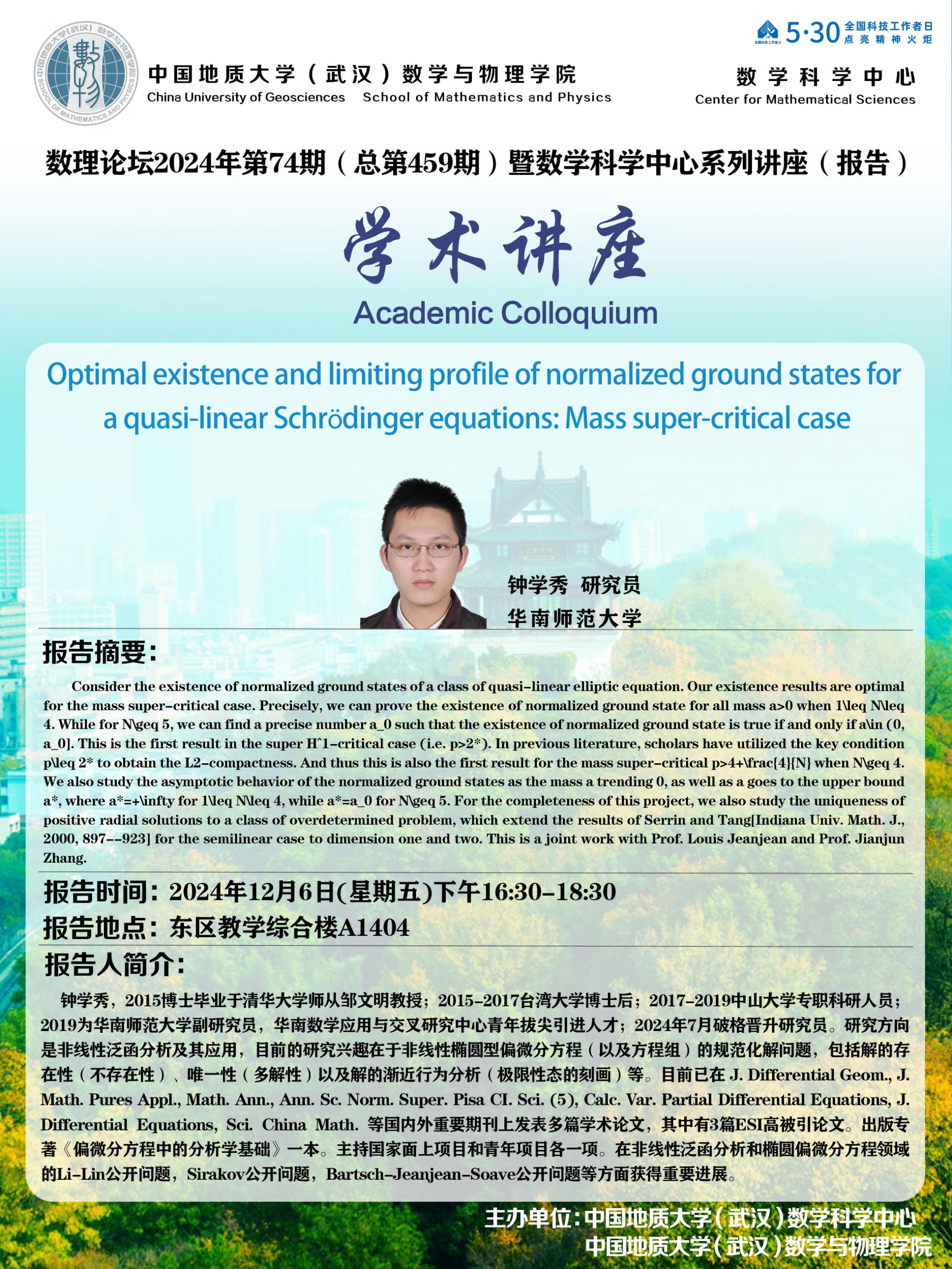 2024年12月6日钟学秀研究员学术讲座:Optimal existence and limiting profile of normalized ground states for a quasi-linear Schrödinger equations: Mass super-critical case
