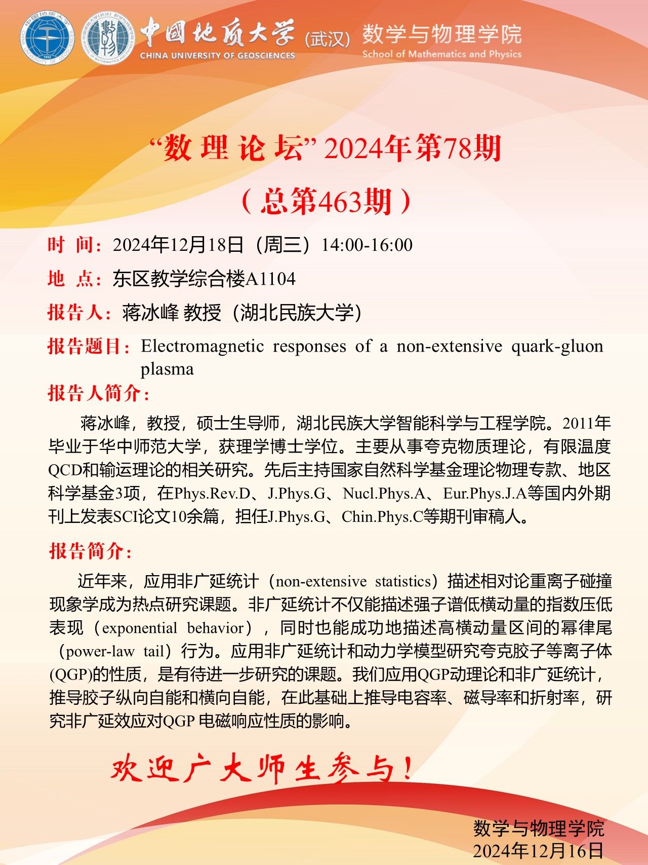 2024年12月18日蒋冰峰教授学术讲座:Electromagnetic responses of a non-extensive quark-gluon plasma