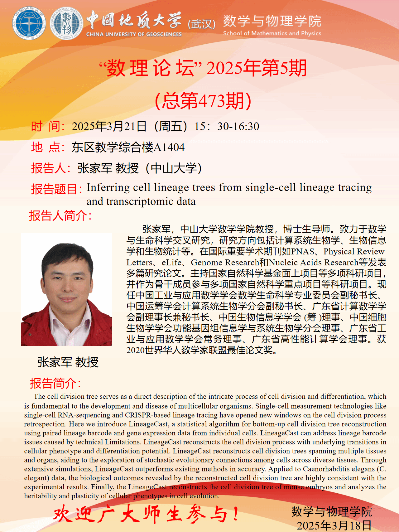 2025年3月21日张家军教授学术报告:Inferring cell lineage trees from single-cell lineage tracing and transcriptomic data
