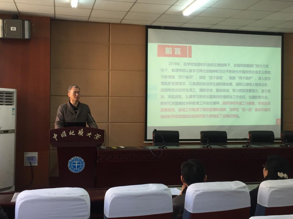 院长郭上江代表学院领导班子作了2019年工作报告。他在报告中全面总结了学院一年来的各项工作,重点介绍了在党建与思想政治工作、学科与人才队伍建设、本科教学工作、科研工作与国际交流、学位与研究生教育工作、实践教学与安全工作、学生工作、少数民族预科生教育管理工作等方面取得的突出成绩,2019年学院取得了以“数学学科特区建设实施方案(2020-2023)”通过校学术委员会审议和校务会审议为代表的10项标志性成绩。对2020年工作进行了展望。