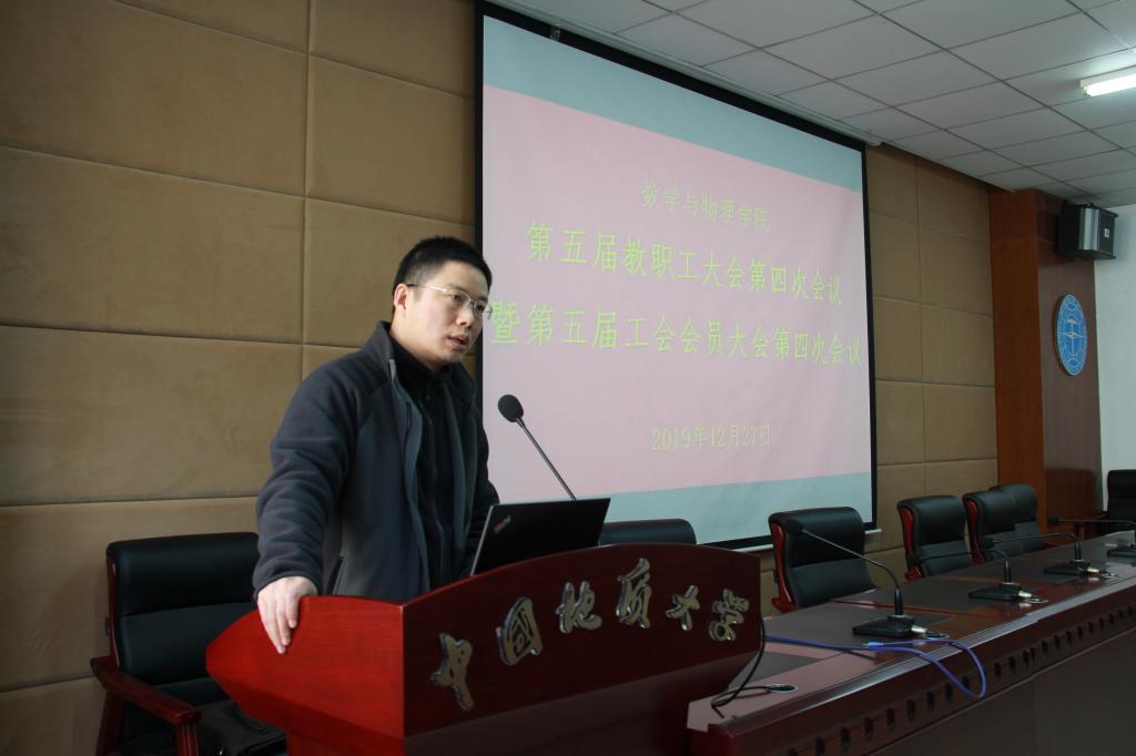 学院分工会主席王希成代表工会委员会做了工会年度工作报告及经费使用说明。他在报告中回顾了2019年工会工作以及学院工会在学校各项比赛中取得的成绩,号召全院教职工和工会会员要认真学习贯彻党的十九大、十九届四中精神,以习近平新时代中国特色社会主义思想为指导,深入研讨实施《数学学科特区建设实施方案(2020-2023)》,进一步推进落实学院“十三五”规划,充分发挥主人翁精神,弘扬“严在地大”优良传统,抓住机遇,迎难而上,为完善学院治理体系,提高学院治理能力,促进学院各项事业迈上新水平、出现新局面而努力奋斗。