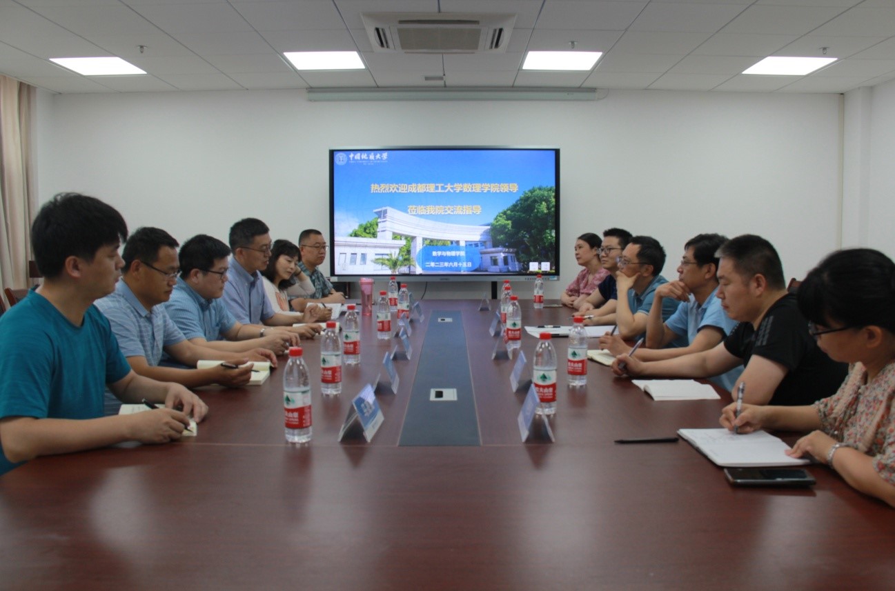 2023年6月15日下午,成都理工大学 ggjav 副院长张传瑜、基础数学教学部主任余海洋、基础数学教学部支部书记舒畅、大学物理教学部副主任史顺平、田荣刚等一行来 ggjav 进行工作交流。学院副院长黄刚、副院长张光勇、大学物理教学部主任陈琦丽、数学系主任王毅、大学数学教学部主任郭艳凤、物理实验中心主任何开华出席了此次会议。会议由副院长黄刚教授主持。