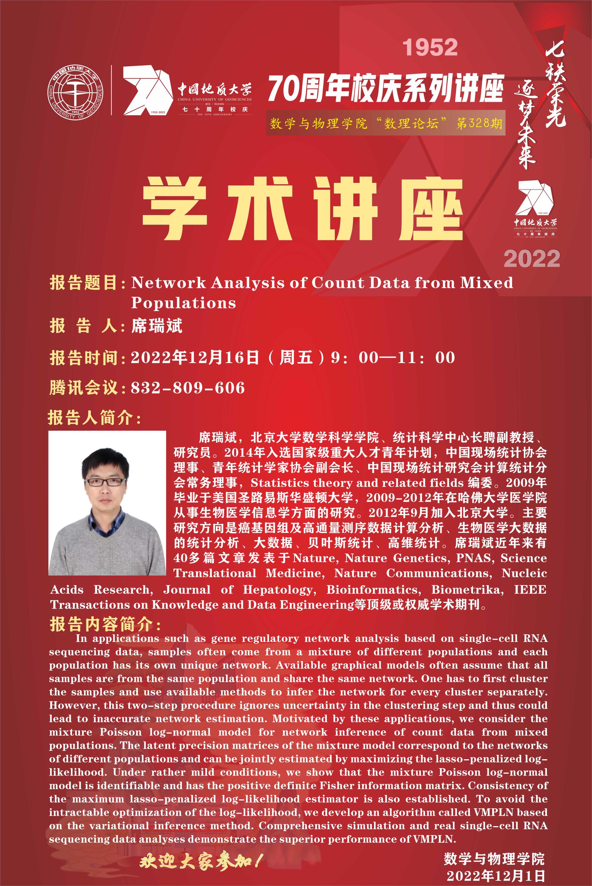 "数理论坛"第328期暨数学科学中心系列讲座(报告):Network Analysis of Count Data from Mixed Populations